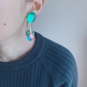 楕円形のクリアグリーンのプラスチックカボションにカラフルな丸型をぶら下げたデザイン。