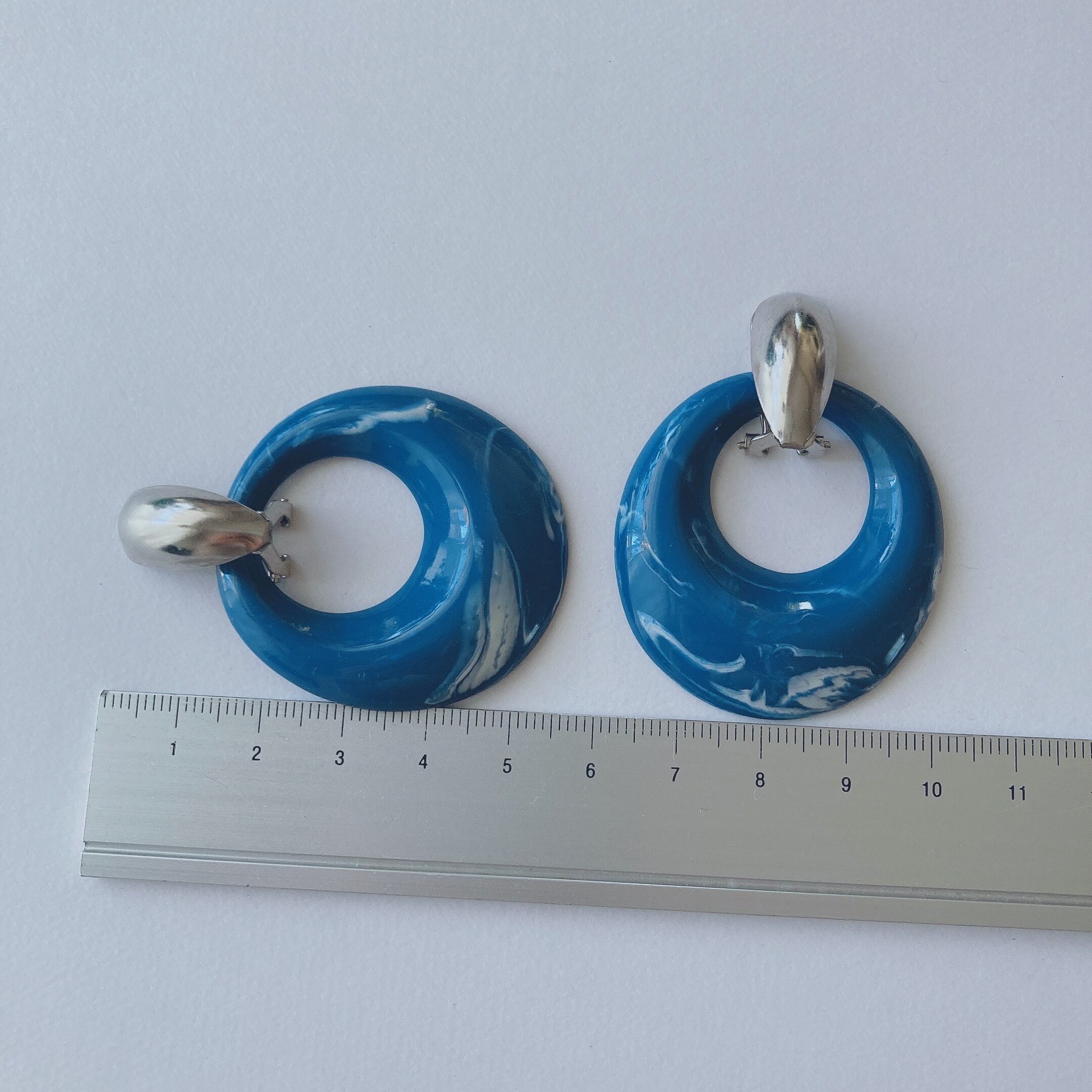 Vintage silver tone blue marble plastic hoop dangle earrings ヴィンテージ シルバートーン ブルー マーブル模様 プラスチック フープ ダングル イヤリング b2213 | OBAKEPEACH