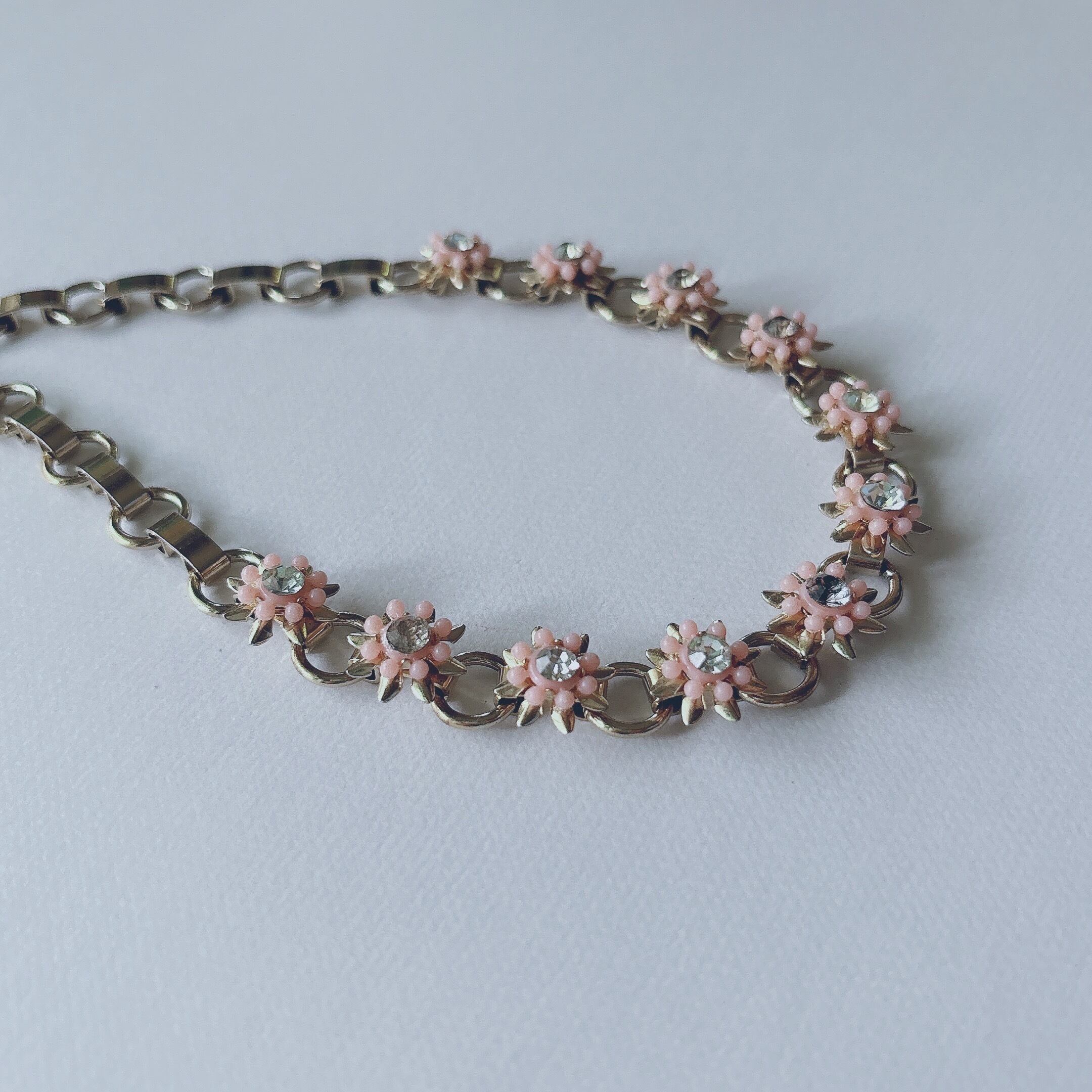 Vintage 50s - 60s gold tone pink plastic flower clear rhinestone necklace choker ヴィンテージ 50年代 - 60年代 ゴールドトーン ピンク プラスチック フラワー クリア ラインストーン ネックレス チョーカー b2103