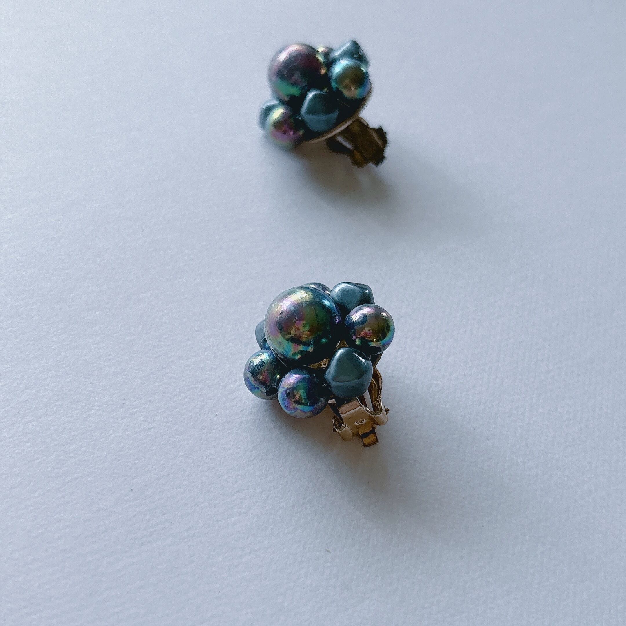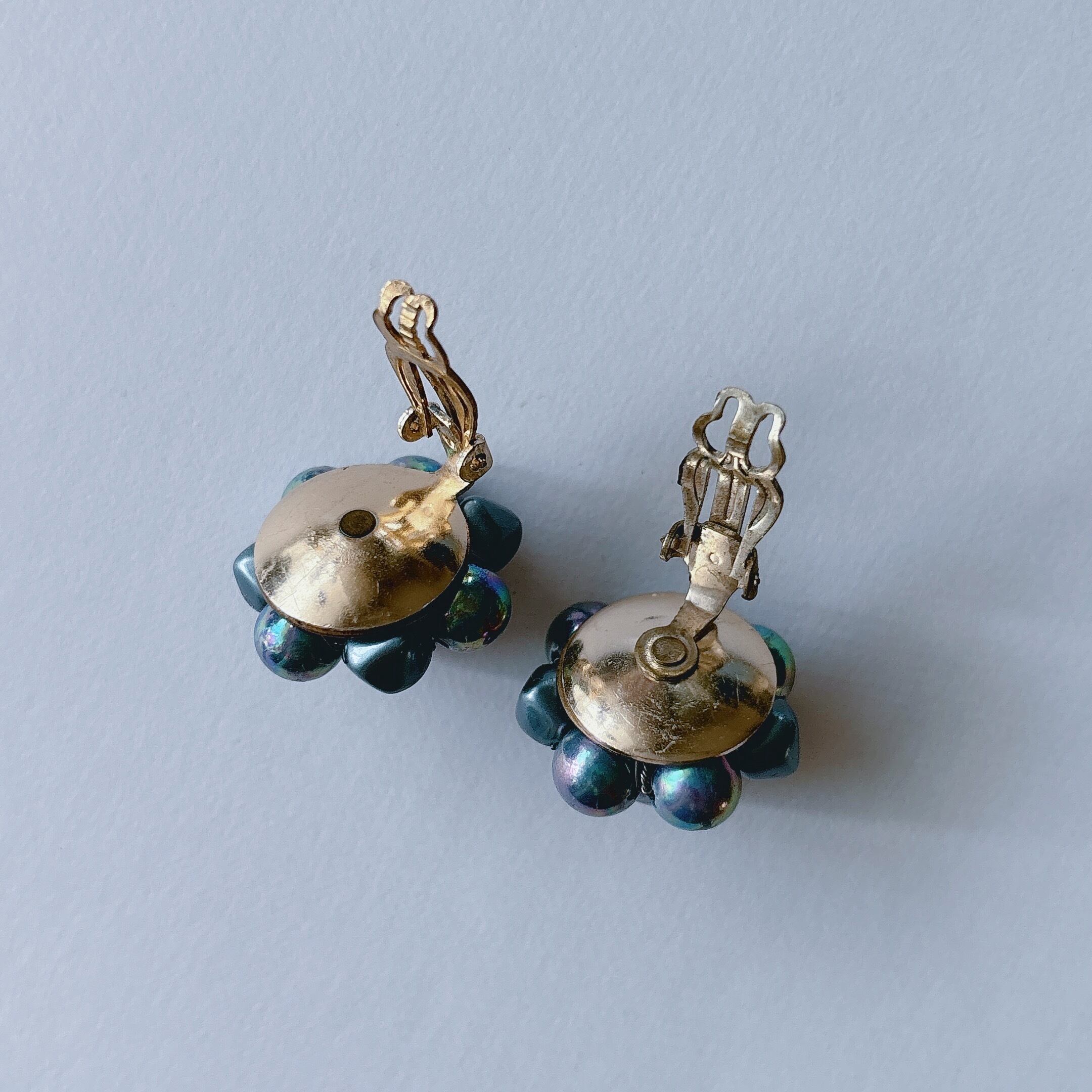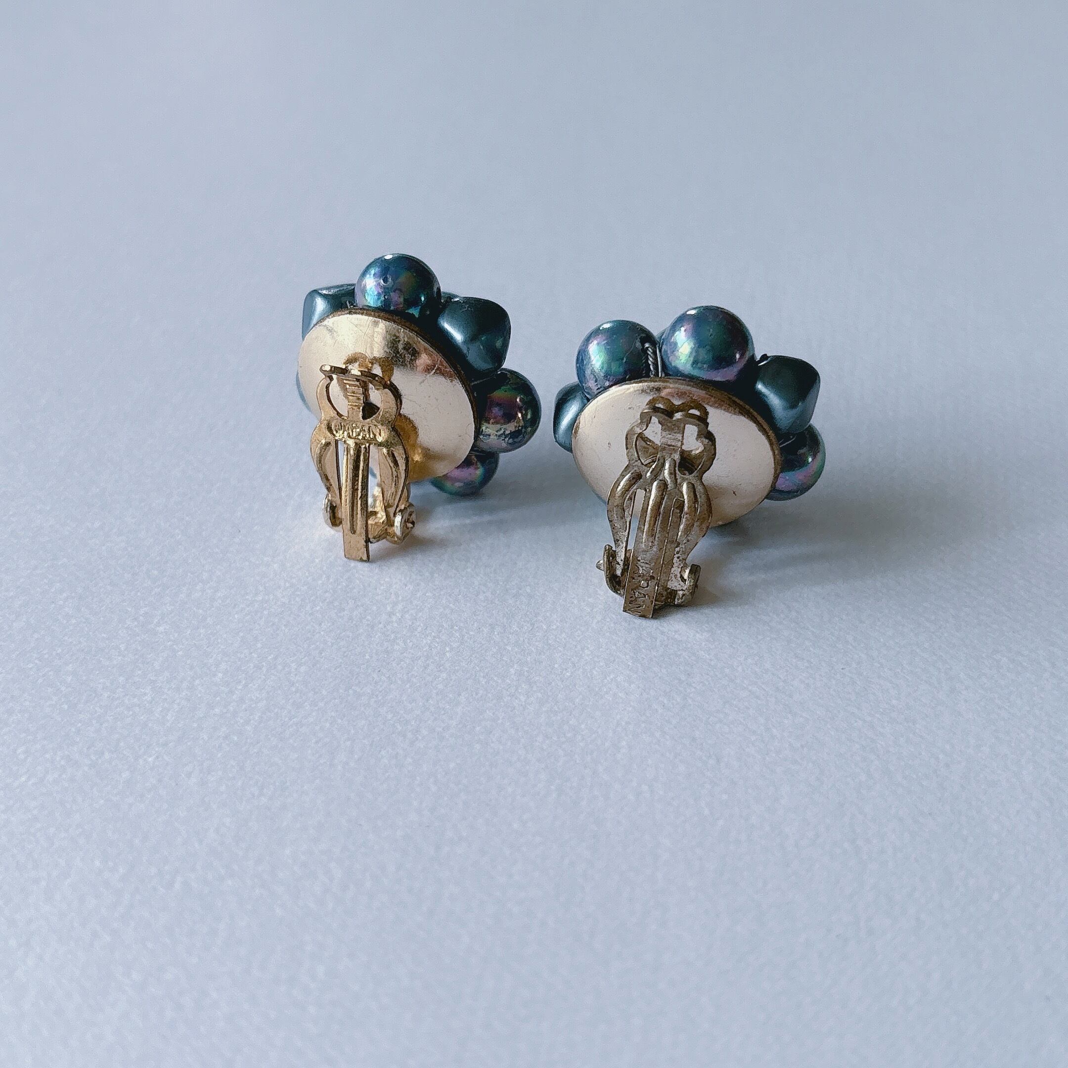 Vintage 50s - 60s JAPAN blue plastic beads cluster flower earrings ヴィンテージ 50年代 - 60年代 日本製 ブルー プラスチック ビーズ クラスター フラワー 花 イヤリング | OBAKEPEACH