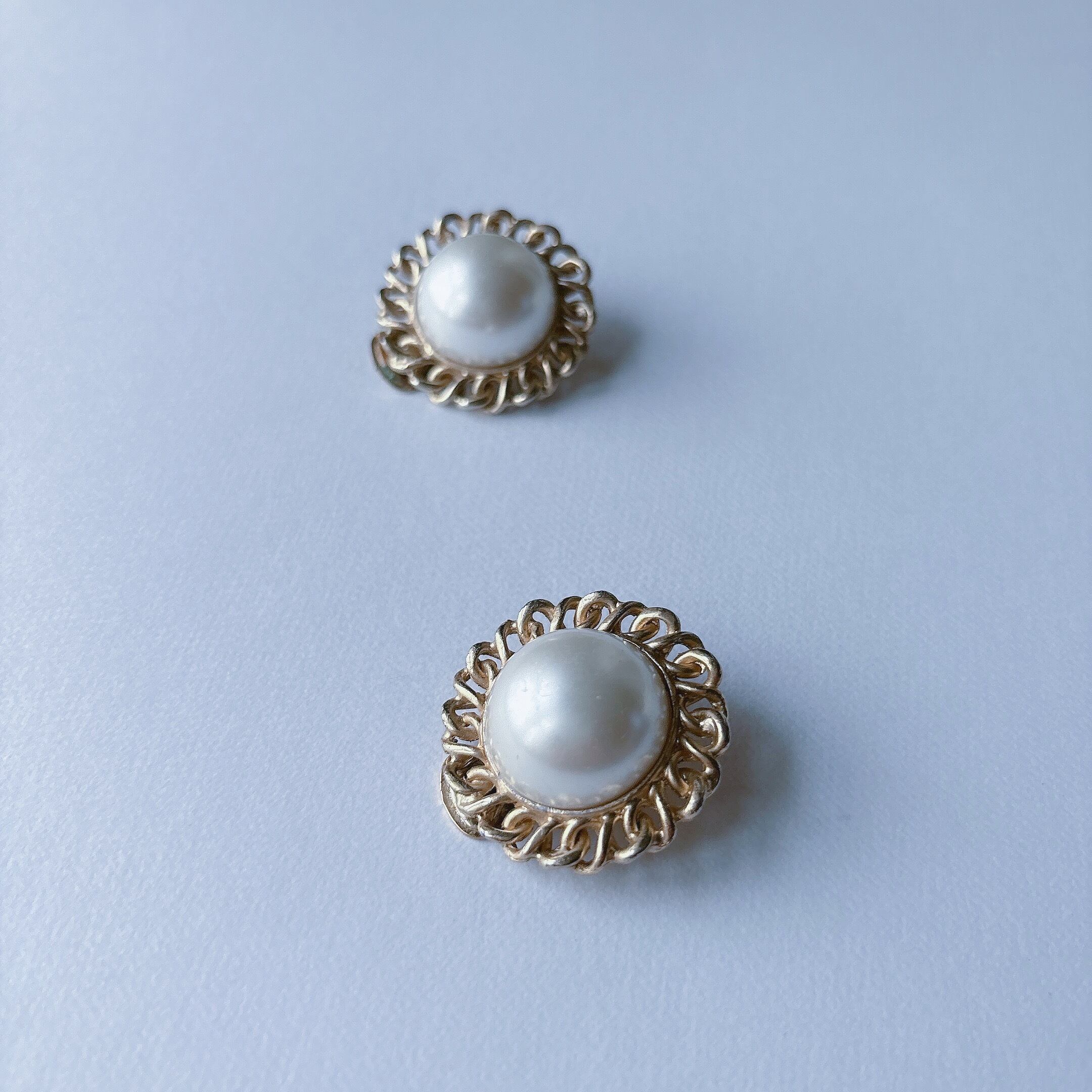 Vintage 80s gold tone faux pearl plastic cabochon earrings ヴィンテージ 80年代 ゴールドトーン フェイクパール プラスチック カボション イヤリング | OBAKEPEACH