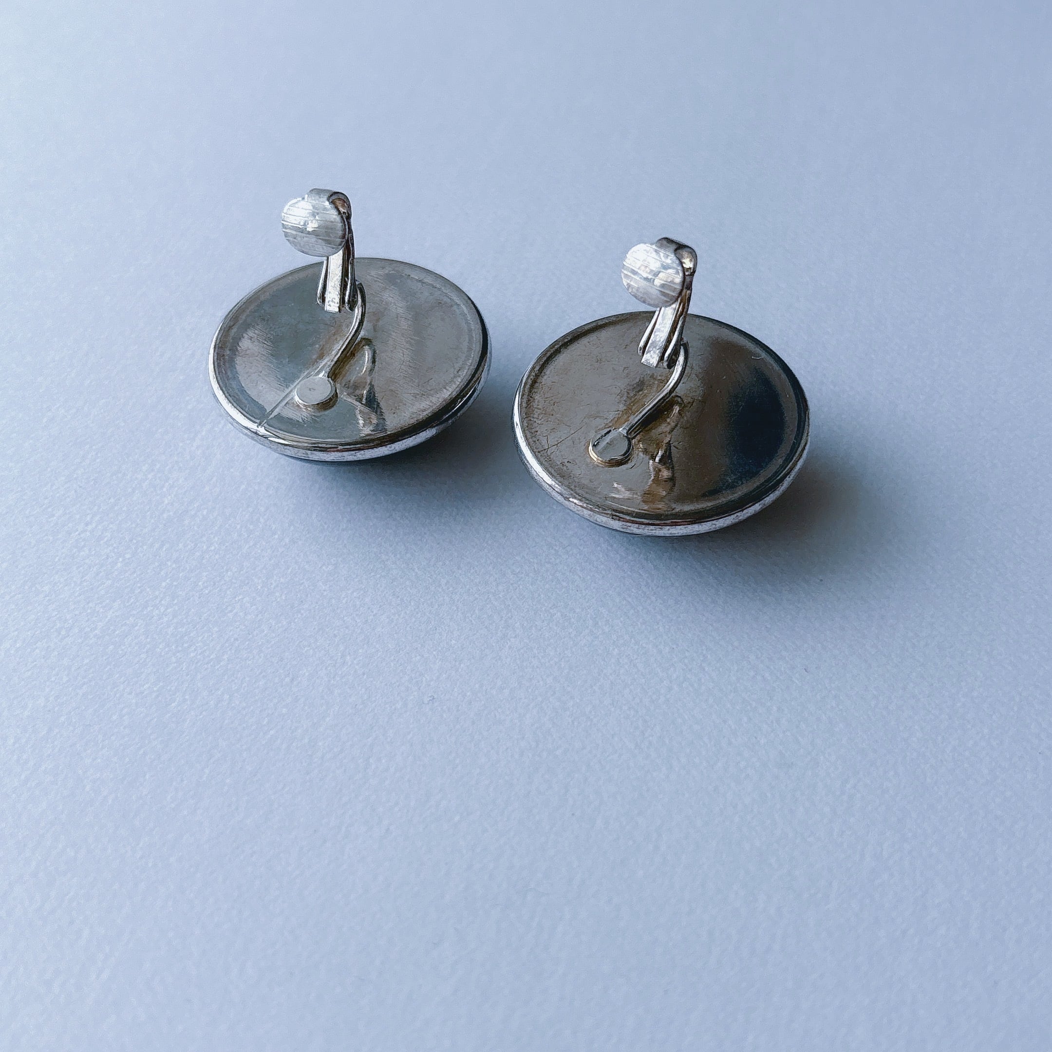Vintage silver tone black marble plastic cabochon earrings ヴィンテージ シルバートーン ブラック マーブル プラスチック カボション イヤリング | OBAKEPEACH