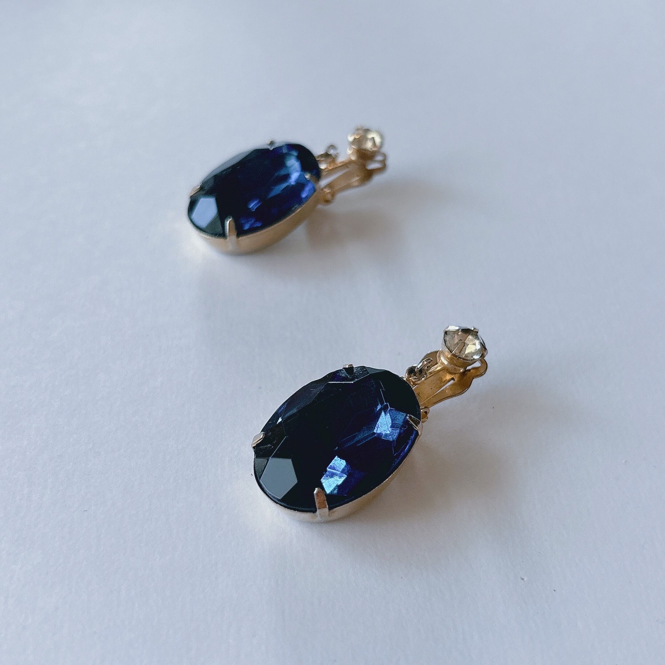 Vintage gold tone blue glass cabochon oval dangle earrings ヴィンテージ ゴールドトーン ブルー ガラス カボション オーバル 楕円形 ダングル イヤリング | OBAKEPEACH