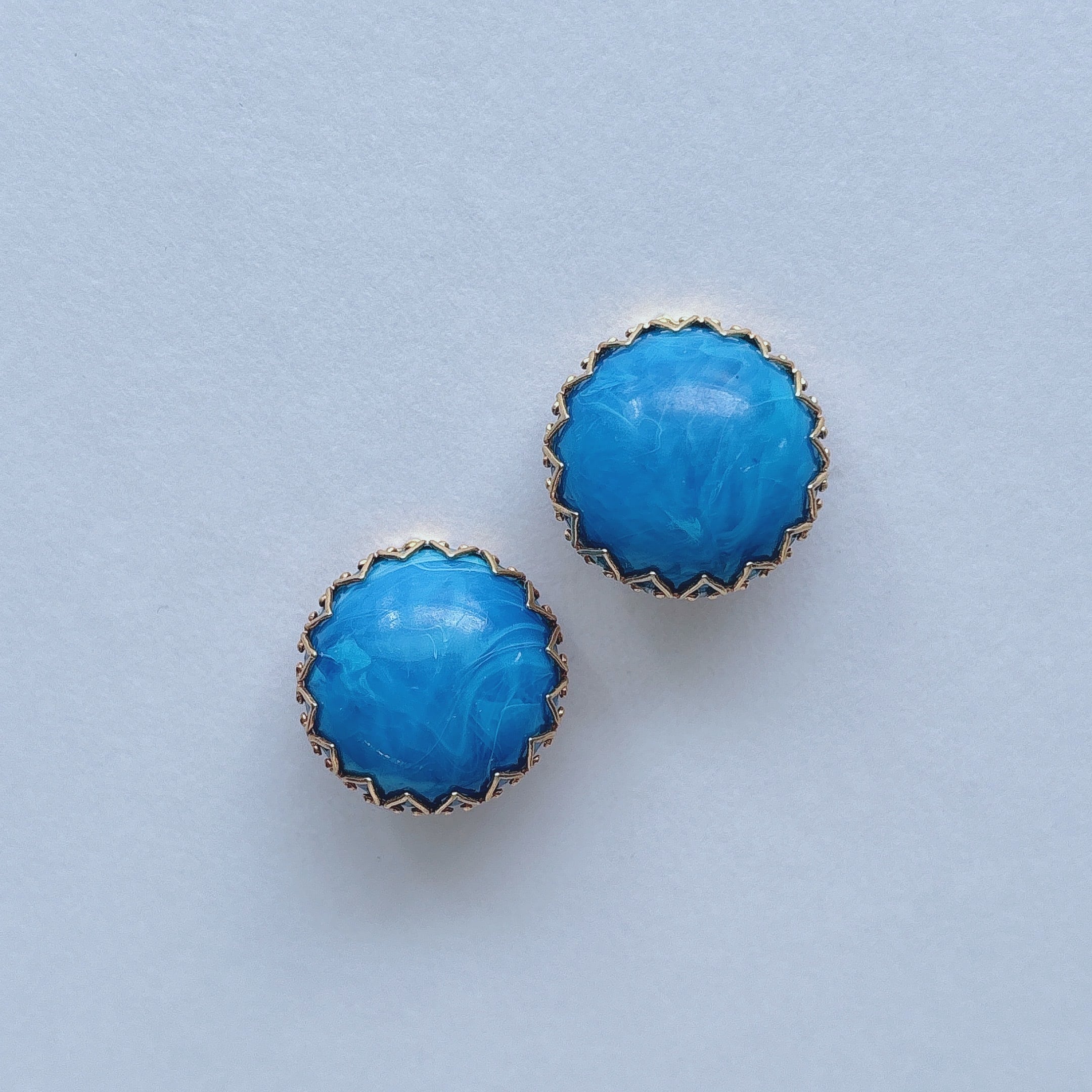 Vintage 60s - 70s gold tone blue plastic cabochon marble circle earrings ヴィンテージ 60年代 - 70年代 ゴールドトーン ブルー プラスチック カボション マーブル模様 丸型 イヤリング | OBAKEPEACH
