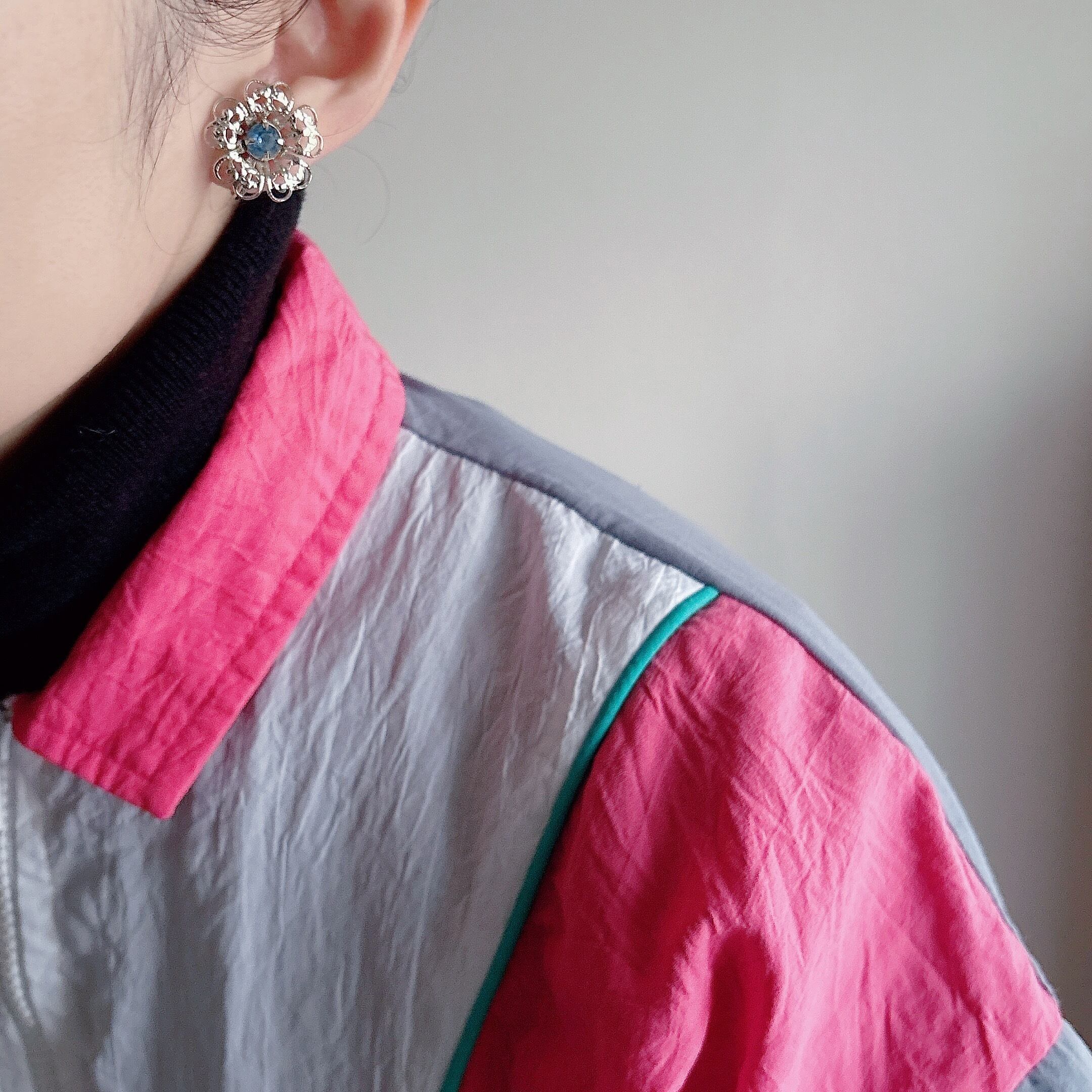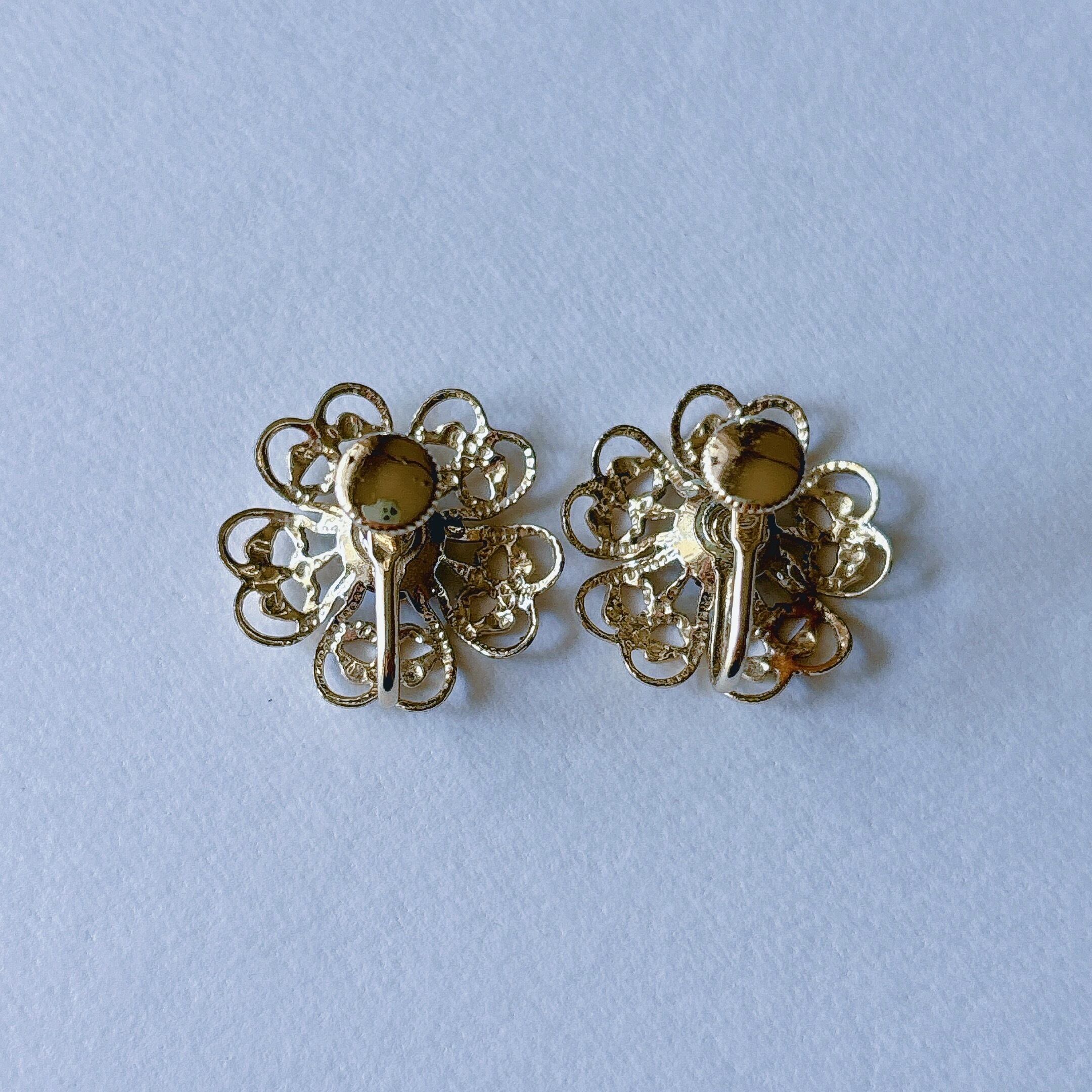 Vintage 50s - 60s gold tone filigree blue rhinestone flower earrings ヴィンテージ 50年代 - 60年代 ゴールドトーン フィリグリー ブルー ラインストーン フラワー 花 イヤリング | OBAKEPEACH