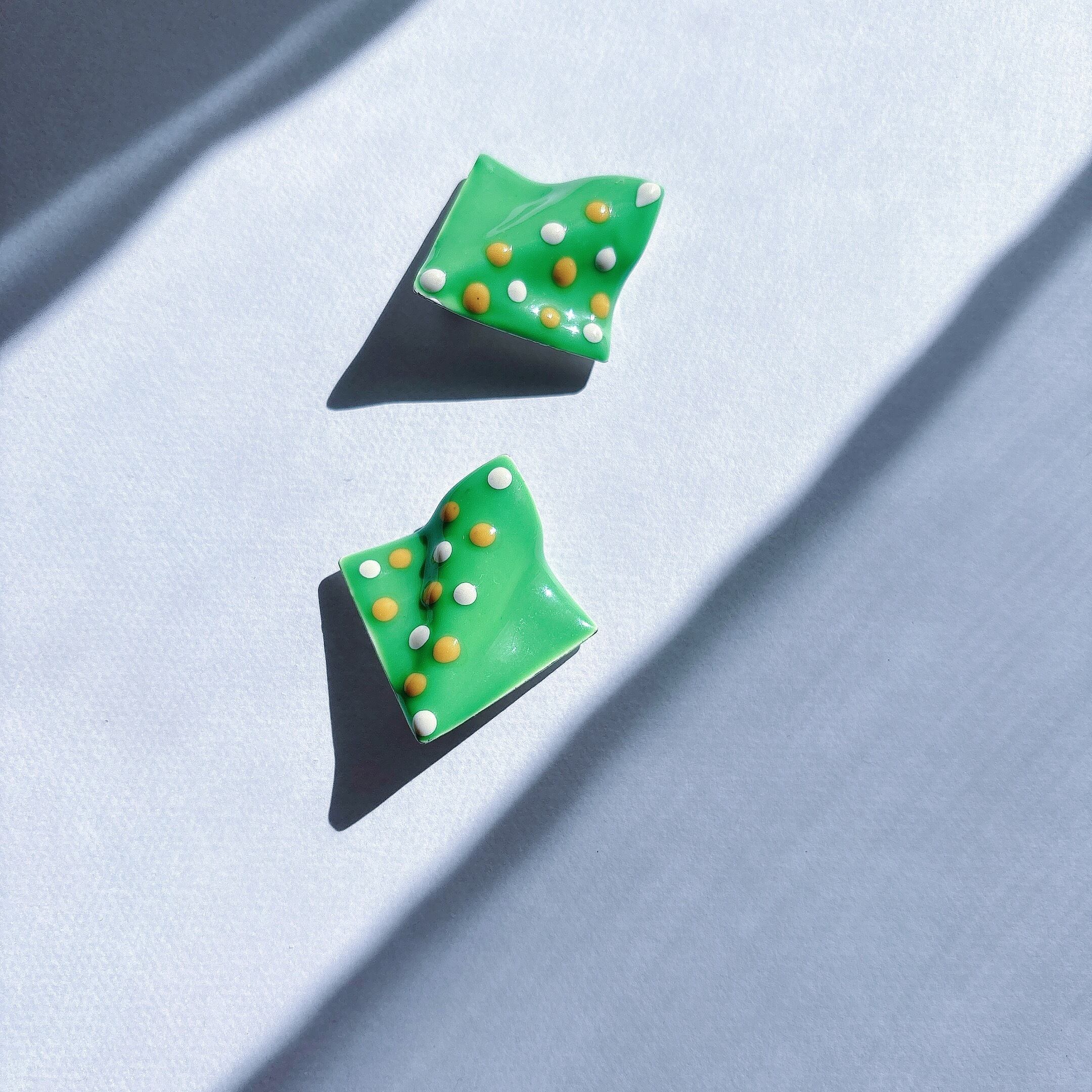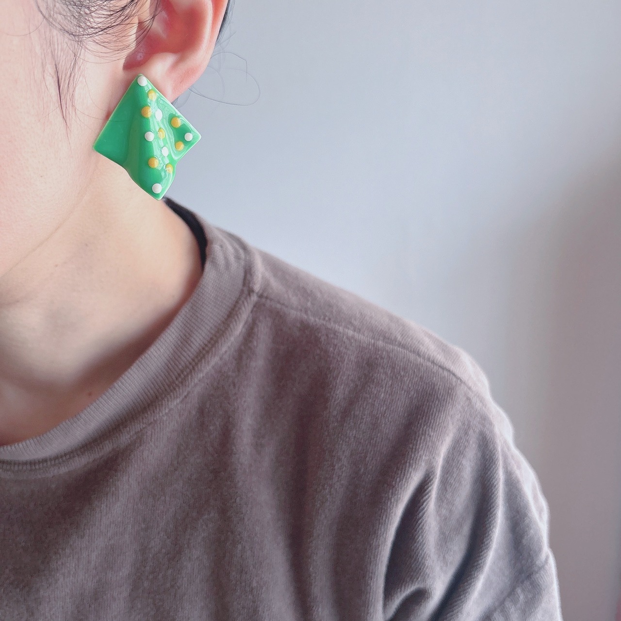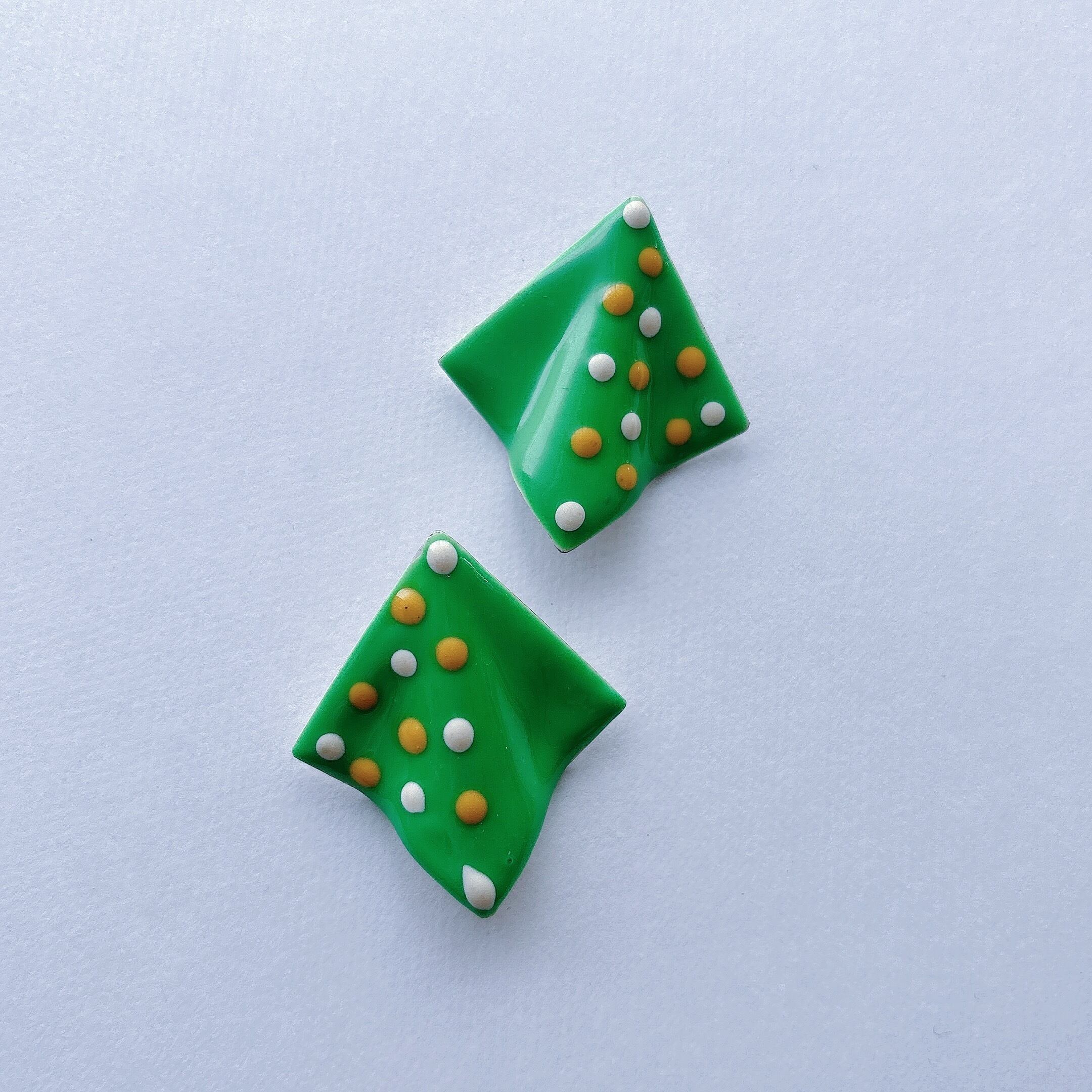 Vintage green yellow white polka dot enamel square earrings ヴィンテージ グリーン イエロー ホワイト 水玉 ドット スクエア 四角 イヤリング